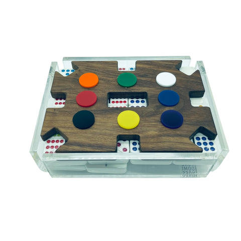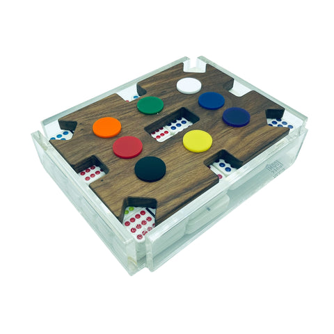 This Double 12 Domino Set is a modern take what is commonly called Mexican Train or just Train dominoes. The walnut lid doubles as the console and comes with 8 color markers to mark your open trains. This set can also be used to play Chicken Foot Dominoes. You can also use the set up to a double 6 for regular dominoes, fives or 42.